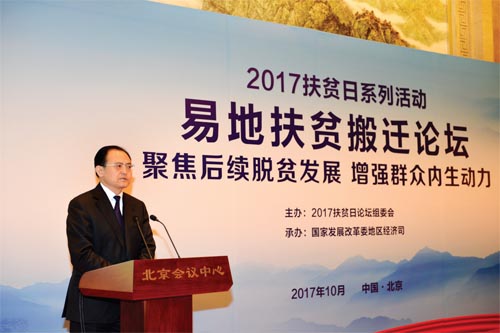 本次論壇以“聚焦后續(xù)脫貧發(fā)展,增強群眾內生動力”為主題,是2017 年扶貧日系列活動之一。來自國家發(fā)改委、人力資源社會保障部、國土資源部、交通運輸部、水利部、農業(yè)部、商務部、中國人民銀行、國家林業(yè)局、國家旅游局、銀監(jiān)會、國務院扶貧辦、全國工商聯(lián)、國家開發(fā)銀行、中國農業(yè)發(fā)展銀行等部門和單位有關司局負責同志,全國22 個有易地扶貧搬遷任務的省份發(fā)展改革委負責同志以及部分省、市、縣從事易地扶貧搬遷工作的干部群眾,帶動搬遷群眾脫貧致富的部分龍頭企業(yè)代表,共約100 人參加了論壇。