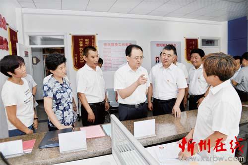 圖為省人大常委會副主任、市委書記李俊明在忻府區(qū)新建路辦事處和諧居委會調(diào)研創(chuàng)建全國文明城市情況。
