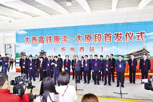 圖為大西高鐵原平至太原段首發(fā)儀式在忻州西站舉行,省人大常委會(huì)副主任、市委書(shū)記李俊明宣布高鐵開(kāi)通并發(fā)出發(fā)車(chē)指令。本報(bào)記者 宮愛(ài)文 攝