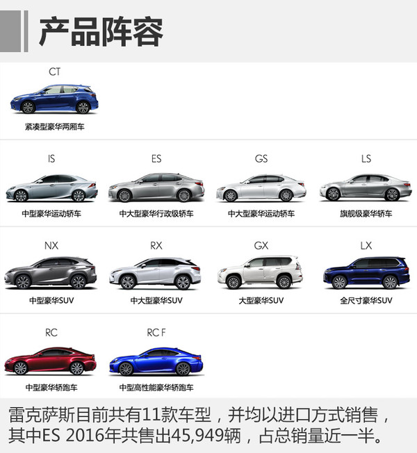 2016年12月,雷克薩斯共售出10,662輛,同比增長5.3%;1-12月累計(jì)銷量達(dá)109,150輛,已經(jīng)超額完成10萬輛的銷量目標(biāo)。在各大豪華品牌不斷加深國產(chǎn)化進(jìn)程的現(xiàn)階段,雷克薩斯自2004年建立獨(dú)立經(jīng)銷商網(wǎng)絡(luò)后,一直保持以進(jìn)口方式銷售的豪華品牌。在十多年的發(fā)展中,其產(chǎn)品矩陣越來越豐富。