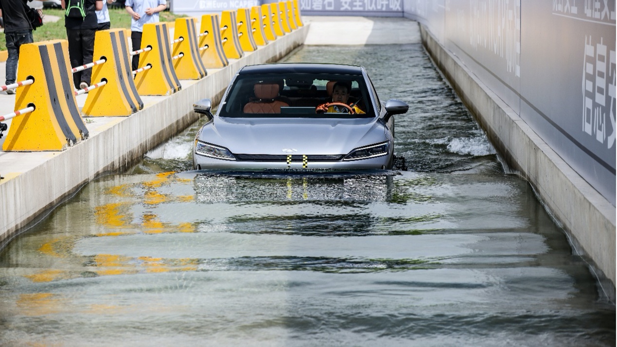 在鐵人三項(xiàng)中,同一輛風(fēng)云A9L模擬極端環(huán)境與事故場景,先經(jīng)過超越國家4倍標(biāo)準(zhǔn)的400mm深水區(qū),隨后又以40km/h時(shí)速、40mm重疊量完成刮底實(shí)驗(yàn),并以超越行業(yè)通常做法2.95~3.36倍的55km/h的速度完成中心柱碰。三大實(shí)驗(yàn)后,車輛動(dòng)力系統(tǒng)完整,電池包無泄漏且絕緣電阻穩(wěn)定在500Ω/V以上。