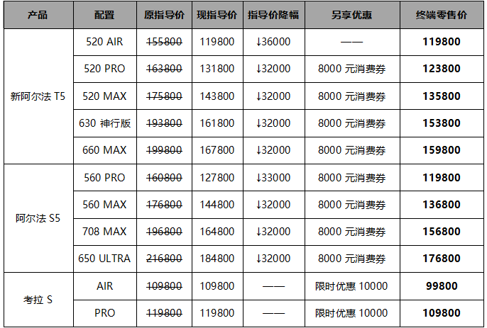 即日起,極狐對新阿爾法T5和阿爾法S5官方指導價進行下調(diào),官方降價32000元,還可另享8000元消費券,如此一來,5系“雙子星”終端零售價最低僅需11.98萬元;考拉S限時優(yōu)惠增至10000元,終端零售價直接下探到了9.98萬元起。
