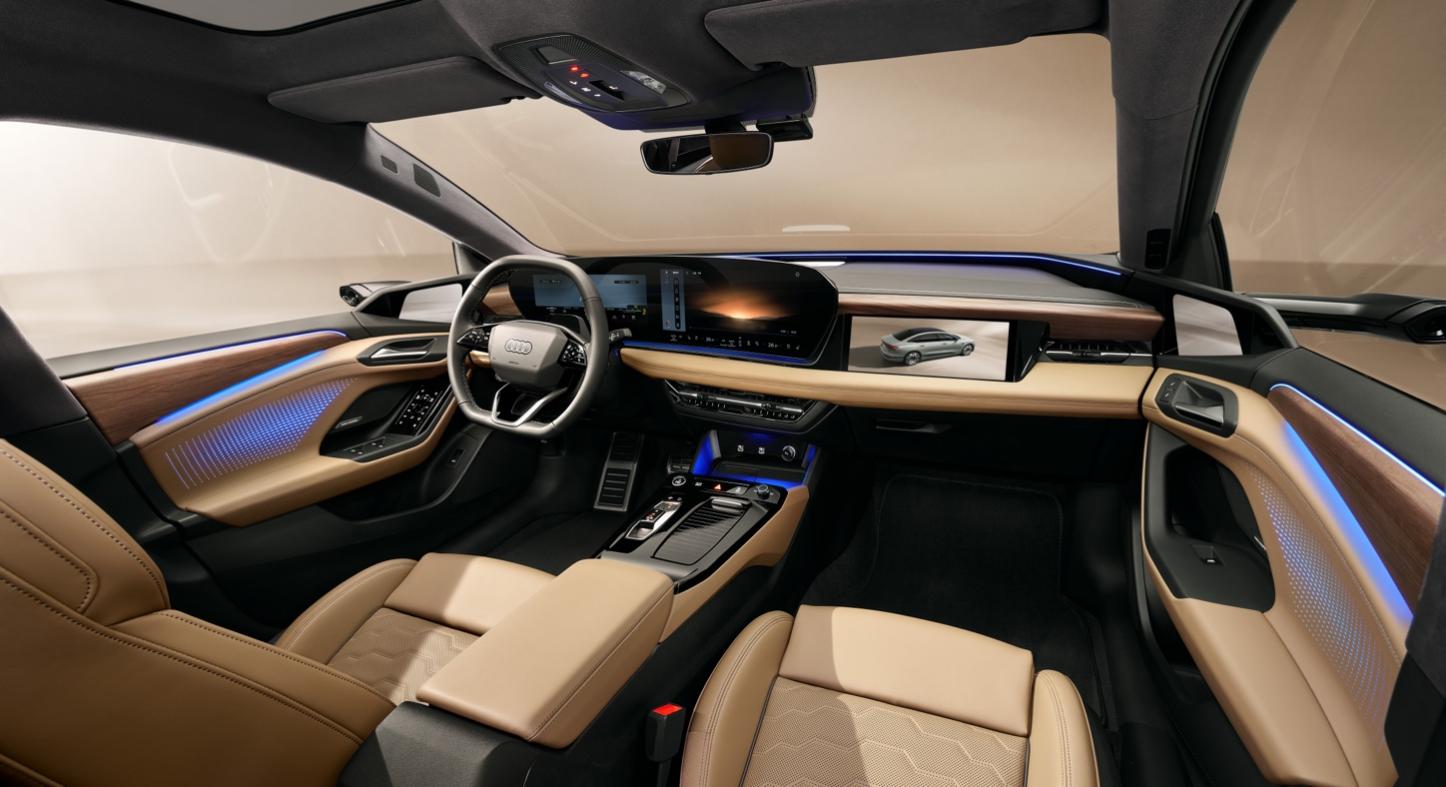 作為電動(dòng)化設(shè)計(jì)的經(jīng)典符號(hào),奧迪 A6L e-tron電池區(qū)域通過側(cè)圍嵌入式黑色高光飾板形成視覺錨點(diǎn)。橫向延展的黑色模塊貫穿車身側(cè)面,與車尾反光條無縫銜接,在強(qiáng)化低重心視覺張力的同時(shí),構(gòu)建出修長流暢的車身比例。奧迪 A6L e-tron還配備第二代流媒體外后視鏡、半隱藏式門把手與1.88 m2超大玻璃面積全景天幕,兼顧功能屬性和美學(xué)價(jià)值,讓豪華體驗(yàn)再進(jìn)階。