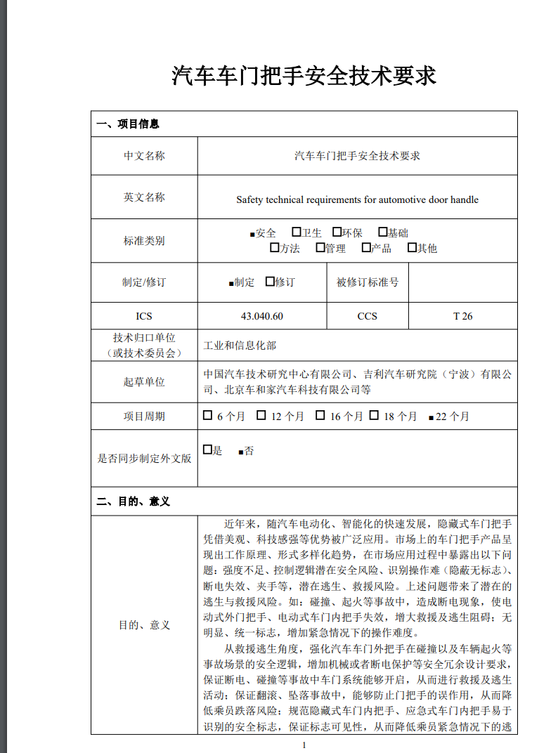 文件中還提到,目前國(guó)外暫無(wú)隱藏式門把手在布置、標(biāo)志、安全功能、結(jié)構(gòu)強(qiáng)度等方面的技術(shù)要求。