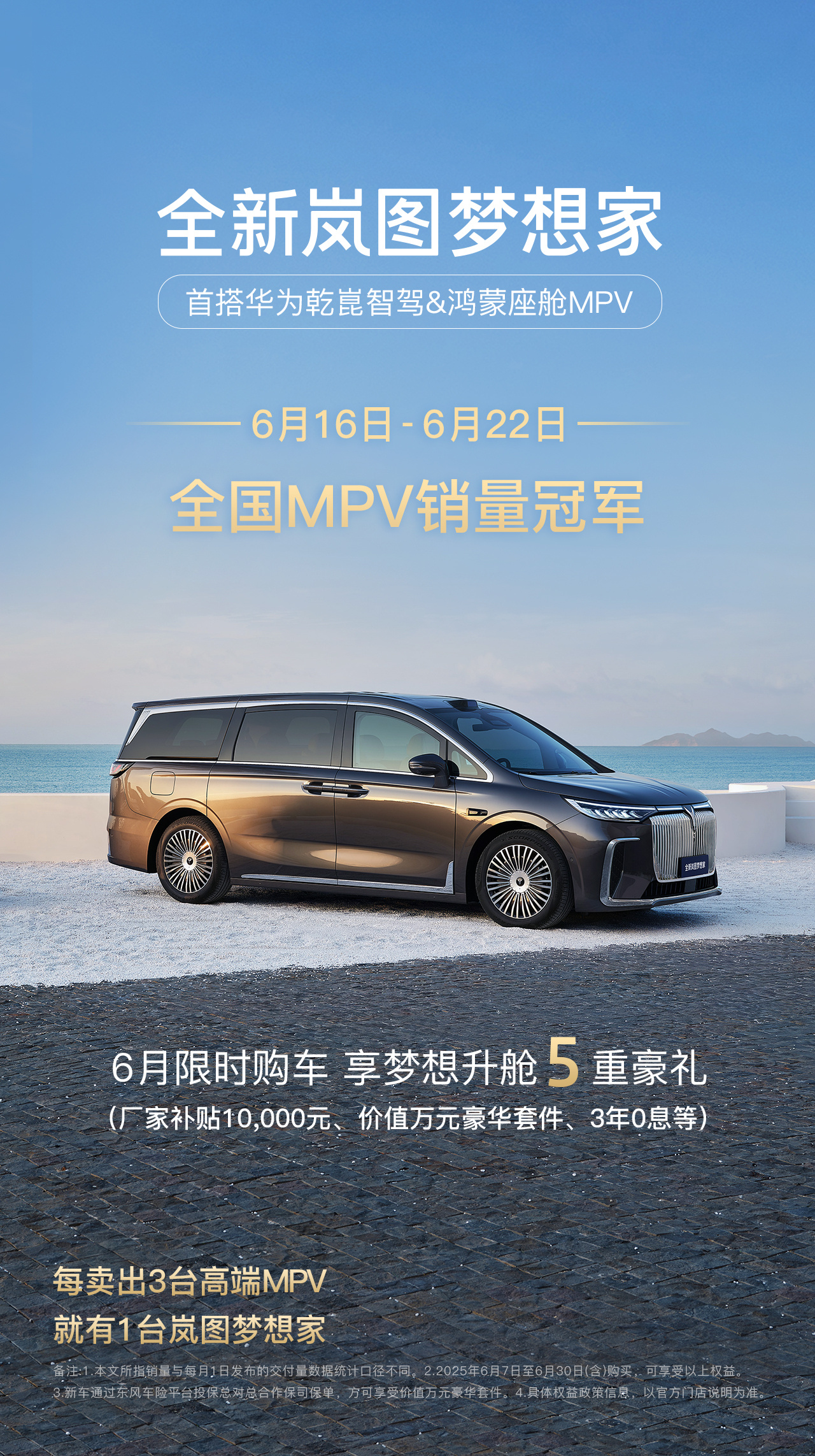 嵐圖夢(mèng)想家6月官宣限時(shí)銷售政策,立省5.5萬(wàn)元現(xiàn)金以及0元升級(jí)價(jià)值萬(wàn)元豪華套件,在政策與產(chǎn)品力雙重疊加下,嵐圖夢(mèng)想家成為當(dāng)下MPV市場(chǎng)熱銷產(chǎn)品。