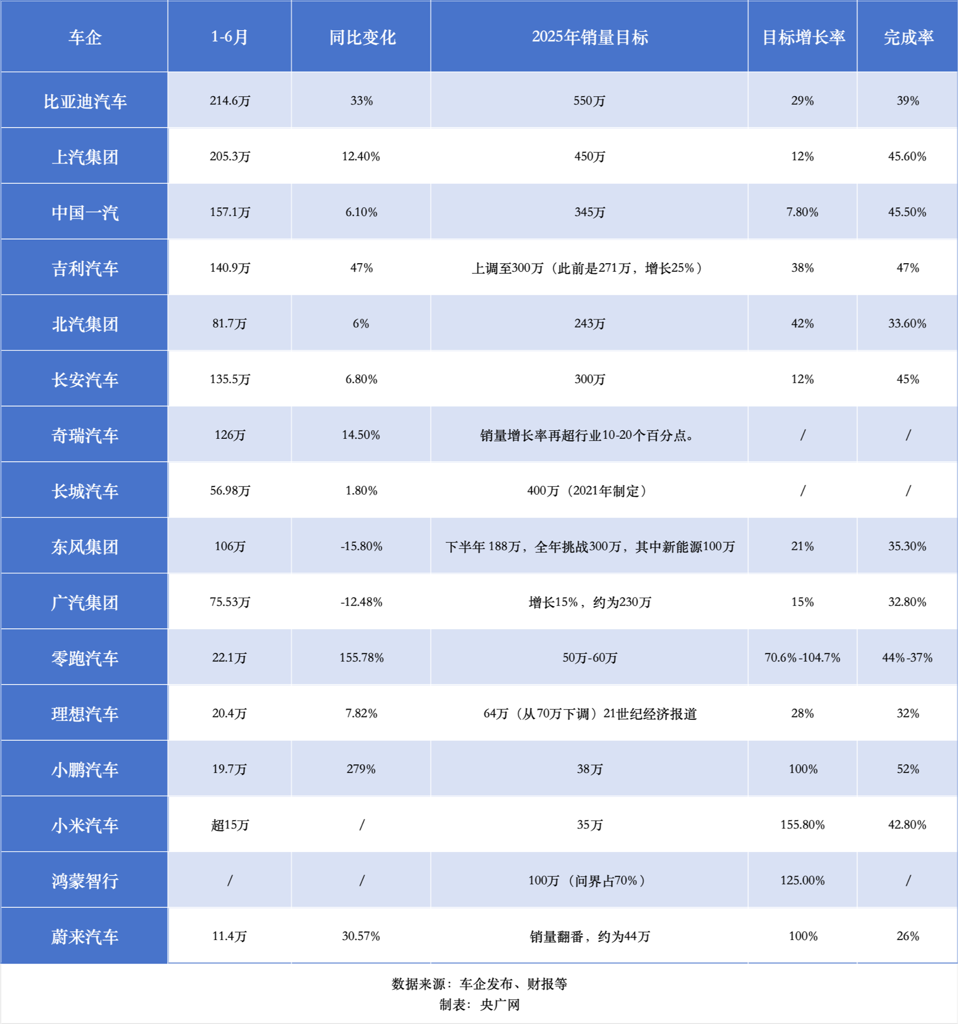 央廣網(wǎng)統(tǒng)計的各大汽車集團(tuán)、車企公布的銷量數(shù)據(jù),目前,蔚來汽車的目標(biāo)完成率低于30%,比亞迪汽車、北汽集團(tuán)、東風(fēng)集團(tuán)、廣汽集團(tuán)、理想汽車5家車企的目標(biāo)完成率在30%-40%之間,上汽集團(tuán)、中國一汽、吉利集團(tuán)、長安汽車、零跑汽車、小鵬汽車、小米汽車7家車企的完成率超過40%。此外,奇瑞集團(tuán)、長城汽車、鴻蒙智行等因數(shù)據(jù)不完善此次不計入統(tǒng)計。