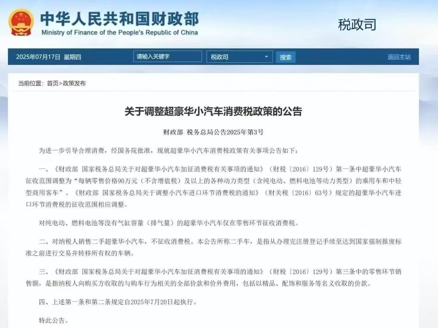 央廣網(wǎng)北京消息(記者董楠)7月17日,財(cái)政部、稅務(wù)總局聯(lián)合發(fā)布公告,對(duì)超豪華小汽車(chē)消費(fèi)稅政策作出調(diào)整。此次調(diào)整不僅將征稅門(mén)檻從130萬(wàn)元(不含增值稅)降至90萬(wàn)元,還在征稅環(huán)節(jié)、車(chē)型差異、二手車(chē)交易等方面做出明確規(guī)范,新政7月20日起正式執(zhí)行。這是2016年我國(guó)對(duì)超豪華小汽車(chē)加征消費(fèi)稅后的首次調(diào)整。