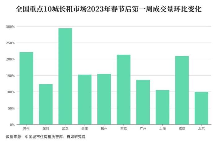 今年春節(jié)期間,中國的旅游、文娛、餐飲等市場(chǎng)明顯升溫,春節(jié)復(fù)工后隨著人員流動(dòng)量增加。智庫和研究院方面認(rèn)為,住房租賃市場(chǎng)的穩(wěn)步回暖應(yīng)是趨勢(shì)。在長租市場(chǎng)成交量整體呈回升趨勢(shì)時(shí),新一線城市的增長幅度明顯高于一線城市。智庫和研究院方面分析,環(huán)比春節(jié)前,北京、上海、深圳三大一線城市春節(jié)后第一周成交量環(huán)比提升近100%;而武漢、南京、成都等新一線城市環(huán)比成交量增長近200%,其中武漢增長約300%。