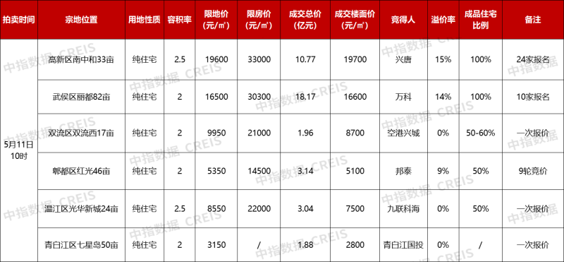 據(jù)中指研究院監(jiān)測(cè),本次出讓中,只有2宗宅地位于主城區(qū),其獲得關(guān)注熱度高、參拍企業(yè)多。最終,高新區(qū)南中和33畝宗地和武侯區(qū)麗都82畝宗地價(jià)格達(dá)到觸頂“熔斷”,分別由興唐地產(chǎn)和萬科以樓面價(jià)19700元/平方米、16600元/平方米搖中。