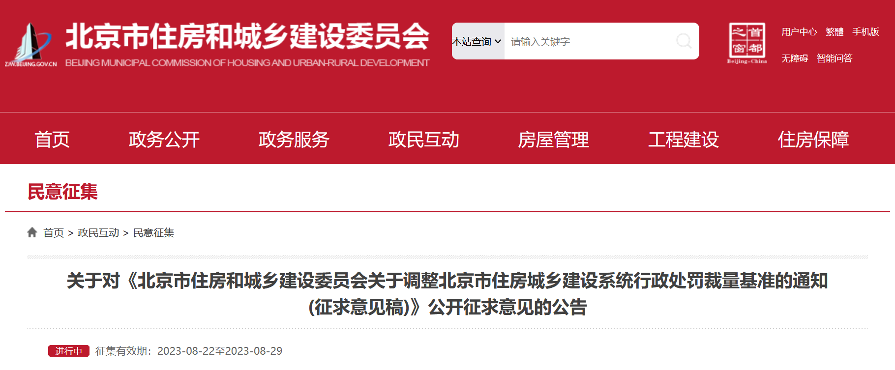 央廣網北京8月23日消息 據(jù)北京市住房和城鄉(xiāng)建設委員網站消息,為貫徹落實《建設工程質量檢測管理辦法》《房地產開發(fā)企業(yè)資質管理規(guī)定》相關處罰職權,北京市住房和城鄉(xiāng)建設委員會制定了《北京市住房和城鄉(xiāng)建設委員會關于調整北京市住房城鄉(xiāng)建設系統(tǒng)行政處罰裁量基準的通知(征求意見稿)》,現(xiàn)向社會公開征求意見。公開征集意見時間為:2023年8月22日至8月29日。