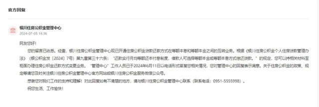 收到留言后,銀川住房公積金管理中心作出公開回復。回復稱:經查,銀川住房公積金管理中心現已開通住房公積金貸款還款方式在等額本息和等額本金之間的互轉業(yè)務。網友可以持相關材料至柜面辦理住房公積金還款方式變更業(yè)務。