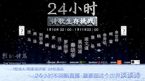 據(jù)了解,從1月10日晚22:00開始,秦導(dǎo)邀請(qǐng)了24位各界知名人士,24小時(shí)不間斷直播接力談詩(shī)歌。自媒體“羅輯思維”創(chuàng)始人羅振宇,著名財(cái)經(jīng)作家、財(cái)經(jīng)自媒體“吳曉波頻道”創(chuàng)始人吳曉波,國(guó)際著名詩(shī)人楊煉,香港著名文化人梁文道,湖南衛(wèi)視著名主持人汪涵,自媒體人袁岳,著名知識(shí)分子余世存,詩(shī)人余秀華,詩(shī)人、詩(shī)歌自媒體“讀首詩(shī)再睡覺”公號(hào)主編流馬,編劇史航,金馬獎(jiǎng)最佳紀(jì)錄片導(dǎo)演周浩,歐洲著名漢學(xué)家柯雷,著名音樂人黑楠等人,將通過現(xiàn)場(chǎng)、電話連線、視頻等多種方式參與本次在線直播活動(dòng),而鳳凰衛(wèi)視著名主持人曹景行、著名主持人崔永元以及詩(shī)歌評(píng)論家唐曉渡也有望一起參與。