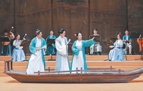 北京民族樂團(tuán)玖樂室內(nèi)樂組合擔(dān)任現(xiàn)場演奏,24首樂曲穿插在劇情中,訴盡人世間的離合悲歡。這些音樂作品既有傳統(tǒng)古曲,也有改編自影視音樂的當(dāng)代作品片段,與劇情故事的發(fā)展嚴(yán)絲合縫地呼應(yīng)。玖樂室內(nèi)樂組合的成員身穿宋制服裝,坐在舞臺后方,與舞臺正中央的一葉孤舟呼應(yīng),讓《人生的盛宴》的舞臺有如古畫。民樂室內(nèi)樂的現(xiàn)場演奏不僅僅是伴奏或添彩,更是劇目呈現(xiàn)不可或缺的一部分。