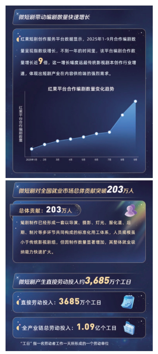 這不僅大幅提升了人力資源的利用效率,也為從業(yè)人員帶來了長期且穩(wěn)定的工作預(yù)期,吸引了大量人才涌入。以編劇為例,紅果短劇創(chuàng)作服務(wù)平臺(tái)數(shù)據(jù)顯示,2025年1-9月合作編劇數(shù)量呈現(xiàn)指數(shù)級(jí)增長,不到一年的時(shí)間里,平臺(tái)編劇合作數(shù)量增長近9倍,遠(yuǎn)超傳統(tǒng)影視劇本創(chuàng)作行業(yè)增速。