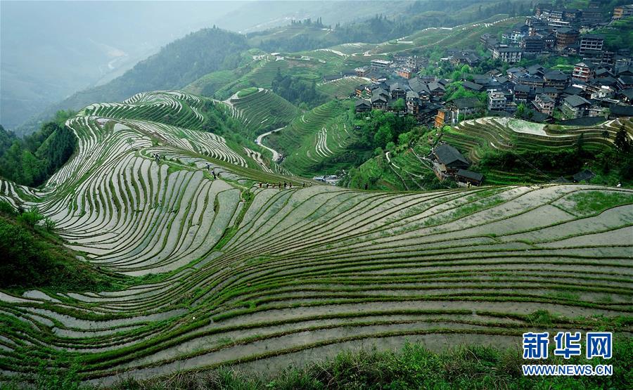 如今,梯田不僅是生存的載體,更已經(jīng)成為一種獨特的旅游資源,被稱為“地球上最美的曲線”。尤其春天,站在山頂放眼望去,形狀各異的大小梯田盛滿清泉,縱橫交錯的田埂如蛛絲一般,農(nóng)民們犁田、砌埂、削壁、灌水, 一個個身影點綴在如鏡般的梯田水面上,構(gòu)成了一幅秀麗壯觀、生機盎然的田園山水畫卷。