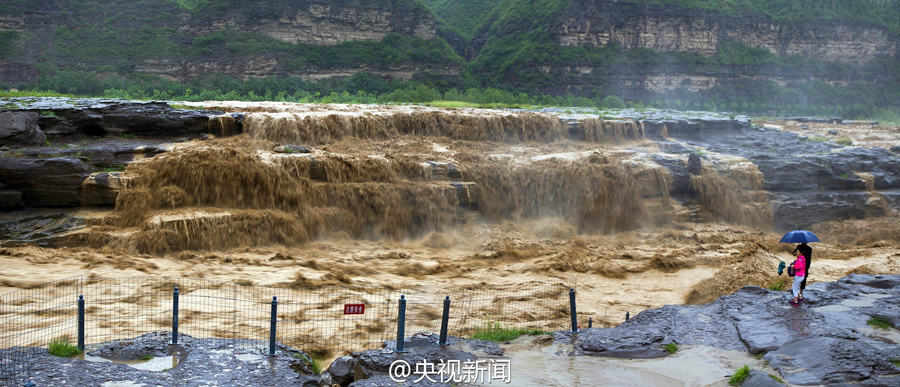 受上游強(qiáng)降雨和水庫放水影響,最近幾天,黃河壺口瀑布迎來伏汛,最大水流量達(dá)到每秒2600立方米左右,濁流滾滾奔騰而下,氣勢(shì)磅礴?。ㄑ胍曈浾呃钪?文豪)