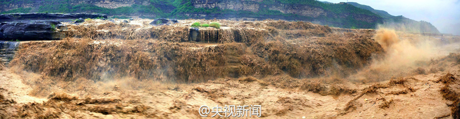 受上游強(qiáng)降雨和水庫放水影響,最近幾天,黃河壺口瀑布迎來伏汛,最大水流量達(dá)到每秒2600立方米左右,濁流滾滾奔騰而下,氣勢磅礴?。ㄑ胍曈浾呃钪?文豪)