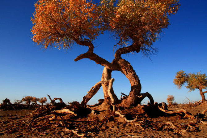 胡楊林是塔里木河流域典型的荒漠森林草甸植被類型,從上游河谷到下游河床均有分布。雖然胡楊林結(jié)構(gòu)相對(duì)簡(jiǎn)單,但具有很強(qiáng)的地帶性生態(tài)烙印。無(wú)論是朝霞映染,還是身披夕陽(yáng),它在給人以神秘感的同時(shí),也讓人解讀到生機(jī)與希望。據(jù)有關(guān)資料顯示,人們還夸贊胡楊巨大的生命力是“三個(gè)一千年”,即活著一千年不死,死后一千年不倒,倒后一千年不朽。