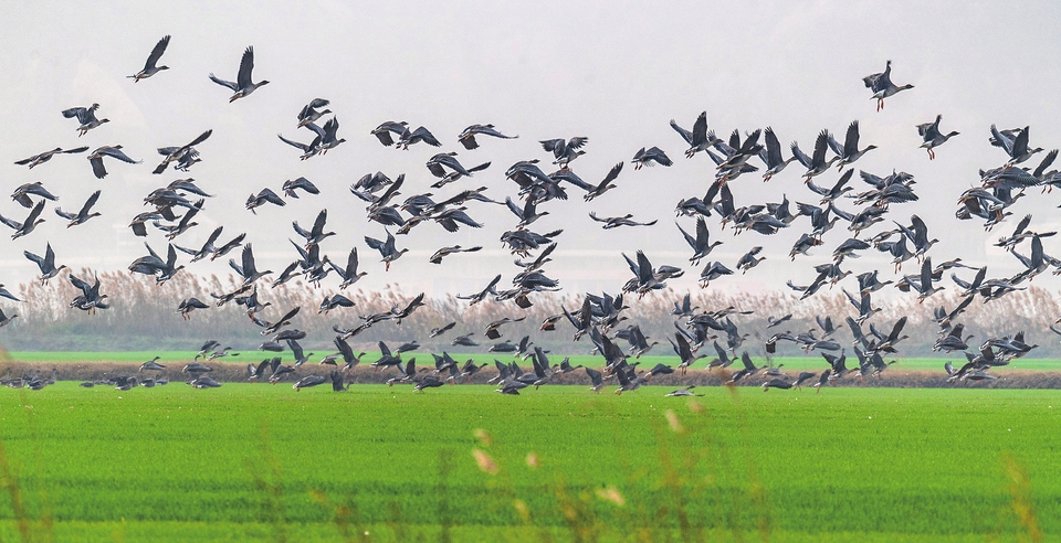 11月24日,國(guó)家二級(jí)保護(hù)動(dòng)物豆雁在臨猗縣黃河濕地飛翔,給冬季的濕地注入了生機(jī)與活力。近年來,當(dāng)?shù)夭粩嗉哟簏S河流域生態(tài)保護(hù)力度,對(duì)野生鳥類開展“護(hù)飛行動(dòng)”,黃河濕地生態(tài)環(huán)境越來越好,來此越冬的鳥類數(shù)量和種類逐年增加。