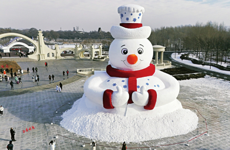 12月8日,哈爾濱今冬第一個(gè)大雪人“雪人先生”在太陽島風(fēng)景區(qū)落成。大雪人高20米,用雪量4000立方米。圖為12月9日在哈爾濱太陽島風(fēng)景區(qū)正門廣場拍攝的大雪人(無人機(jī)照片)。
