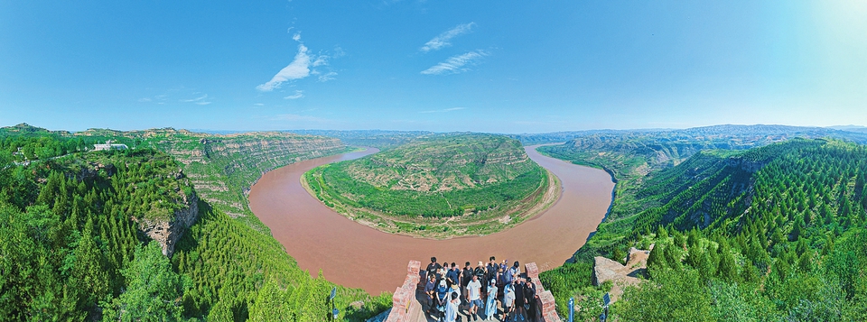 8月19日,游客在永和縣乾坤灣景區(qū)游覽觀光、合影留念。近年來,該縣不斷提高當?shù)厣指采w率,并依托紅色旅游資源發(fā)展文旅經(jīng)濟,把東征村156孔窯洞改造成民宿旅館,增加了村集體和村民收入。