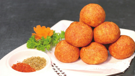 豆腐丸子精選五臺山鹵水豆腐,擠出多余水分,壓成細膩豆腐碎,加入佐料攪拌,揉成圓潤緊實的丸子,蒸制后在麥芽糖水中定型再開炸,外衣漸鍍“金甲”,內(nèi)里卻保持著豆腐的柔嫩本味。