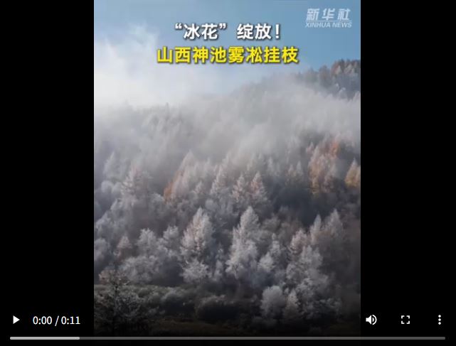 初冬時(shí)節(jié),山西神池國(guó)家登山步道出現(xiàn)霧凇景觀。金色的樹(shù)枝上掛滿(mǎn)冰晶,微風(fēng)徐來(lái),霧凇輕盈搖曳,還有牛羊在山坡上悠閑地吃草。霧凇宛如一層白色的薄紗,將整個(gè)森林籠罩其間,如夢(mèng)如幻。
