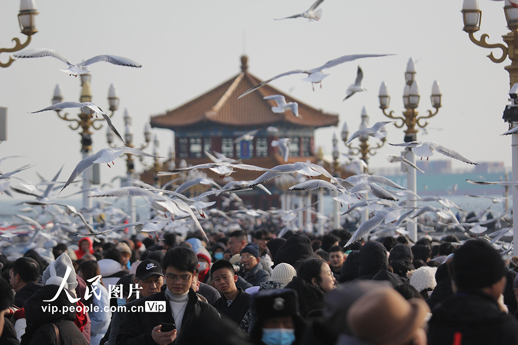 2026年1月30日,山東青島棧橋景區(qū),成群的海鷗在空中飛翔盤(pán)旋,吸引眾多游客前來(lái)觀賞互動(dòng),拍照留影。黃杰顯攝(人民圖片網(wǎng))