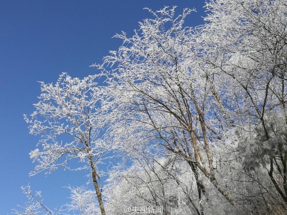 受較強冷空氣影響,秦嶺腹地涼風埡山頂,出現大面積霧凇景觀。玉樹瓊枝,晶瑩剔透,讓涼風埡山頂變得像童話世界一般,美不勝收。 央視記者王志杰 圖片來源:央視新聞微博