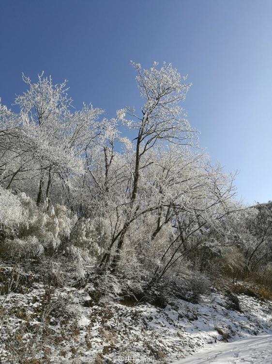 受較強冷空氣影響,秦嶺腹地涼風(fēng)埡山頂,出現(xiàn)大面積霧凇景觀。玉樹瓊枝,晶瑩剔透,讓涼風(fēng)埡山頂變得像童話世界一般,美不勝收。 央視記者王志杰 圖片來源:央視新聞微博