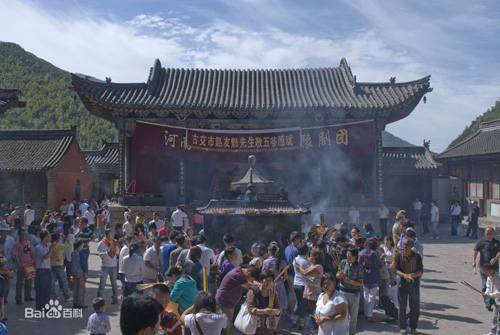 五爺廟也稱萬佛閣座落于臺(tái)懷鎮(zhèn),與大白塔相毗鄰,是通往顯通寺的又一條路徑。寺廟地勢(shì)開闊,當(dāng)年是大清歷代皇帝朝臺(tái)寢宴的行宮,俗稱“皇城”?!盎食恰敝寥f佛閣之間,終年涌動(dòng)著接踵而至的羲圣觀光者。