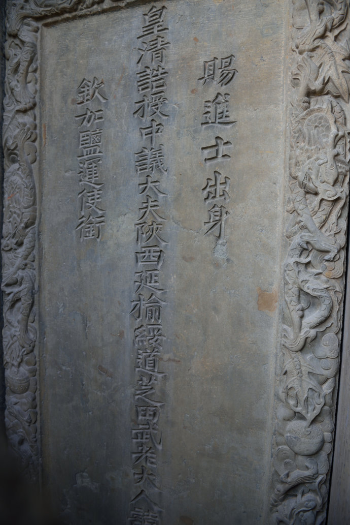 配坊實際上是一座功名石牌坊,上面刊載著武訪疇一家四代人的姓名及朝廷贈封的官爵,咸豐六年(1856)由武訪疇修建。這座石雕牌坊與其它牌坊最大的區(qū)別就是沒有題刻坊名,因此只能稱之為配坊。坐北向南,為四柱三間三樓單檐歇山頂結(jié)構(gòu),牌樓高8米,寬12米,坊體坐落在近1米高的長方形臺基上,立柱仍然采用夾柱石固定。坊頂覆蓋青瓦,正脊飾石雕貔貅裝飾,飛檐翹角,明樓檐下為“圣旨”牌,當(dāng)心間設(shè)兩層小字板,第一層題刻:“贈資政大夫曾祖父廷桂,贈夫人曾祖母李氏;誥贈資政大夫祖父秉壁,誥贈夫人祖母吳氏;誥贈資政大夫父烈,誥封夫人母朱氏。陜西分巡延榆綏兵備道、加四級武訪疇謹(jǐn)建。”第二層題刻“大清咸豐六年歲次丙辰仲夏上院榖旦”。武訪疇借建坊要弘揚(yáng)祖輩陰德,而祖輩的姓氏大名又不能題刻在母親的節(jié)孝牌坊上,所以,他必須另建一坊才能完整地表達(dá)心愿。實際上,這就是建造配坊的真正目的。也正因此在配坊題刻“龍光錫寵”、“鳳詔褒榮”、“克成先志”、“重裕后昆”等。