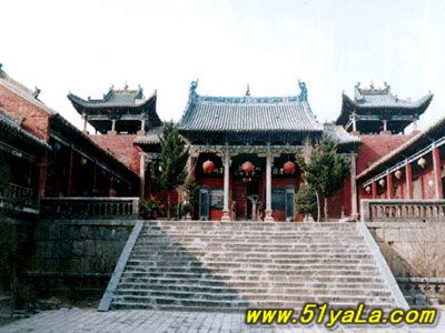 前行有午門.是一座面闊五間,單檐廡殿頂、石雕回廊的廳式建筑。周圍有石欄桿,欄板正反兩面浮雕各類圖案、人物144幅,洋洋大觀,頗有童趣。廳內(nèi)南有周倉、廖化畫像,軒昂威武。北面左右兩側(cè),彩繪著關(guān)羽戎馬一生的主要經(jīng)歷,起于桃園三結(jié)義,止于水淹七軍,只是沒有走麥城這個情節(jié),在全國關(guān)廟壁畫中都按此進(jìn)行,據(jù)說這是因忌諱關(guān)羽自高自大而被殺,終于造成蜀國的覆滅而隱去的。穿過午門,經(jīng)“山海鐘靈”坊、御書樓,便是關(guān)帝廟主體建筑崇寧殿。