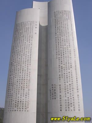 高40公尺的主碑 ,形如一把鋒利的刺刀 。主碑的三個面上,分別鐫刻著彭真、徐向前、薄一波的題詞。彭真的題詞是“戰(zhàn)績輝煌,永垂史冊”;徐向前的題詞是“參加百團(tuán)大戰(zhàn)的烈士們永垂不朽”;薄—波的題詞是“百團(tuán)大戰(zhàn),抗日戰(zhàn)爭中最光輝的一頁,必將載諸史冊,永放光芒?!?/p>