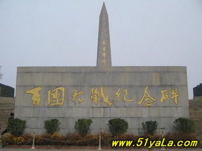“百團(tuán)大戰(zhàn)紀(jì)念碑”座北朝南,由主碑、三座副碑、一座大型圓雕、兩座題字碑、四個烽火臺和長 227米蜿蜒起伏的長城組成,于1987年6月30日建成。