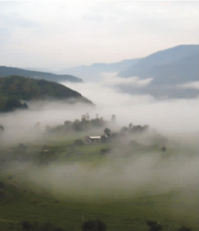 炊煙裊裊的村莊,偷偷地從薄霧里露出惺忪的臉來,時隱時現,猶如傳說中的蓬萊仙島。一個個白族村莊沉浸在美輪美奐的仙境之中,整個峽谷布滿著一幅幅精美絕倫的淡墨山水畫。可惜的是村中的人們還未品嘗出做神仙的滋味,霧海就隨著江面吹來的西風越升越高,不一會兒,就向羅平山頂飄襲而來。我們幾個觀霧者迅即被淹沒在濃濃的云山霧海中,成了騰云駕霧的神仙了。遺憾的是我們還未過足神仙癮,那些飄蕩在山頂的云霧就被熱烈而耀眼的太陽光收回去了,讓我們不得不回到人間,仍去做原來的凡夫俗子。