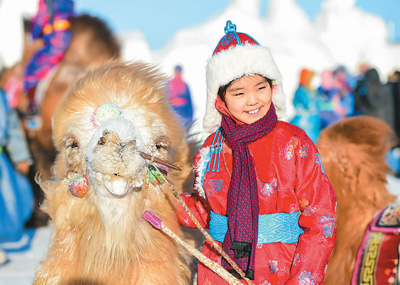 1月9日,內(nèi)蒙古蘇尼特右旗第12屆駱駝文化節(jié)在賽漢塔拉鎮(zhèn)舉行。來自鄂爾多斯、呼倫貝爾以及蘇尼特和烏珠穆沁草原的牧民帶著200多峰駱駝在白雪覆蓋的草原上進行駱駝選美、駱駝競速等比賽。文化節(jié)還舉行了賽馬、搏克等蒙古族傳統(tǒng)體育活動。圖為一名蒙古族小朋友和駱駝合影。