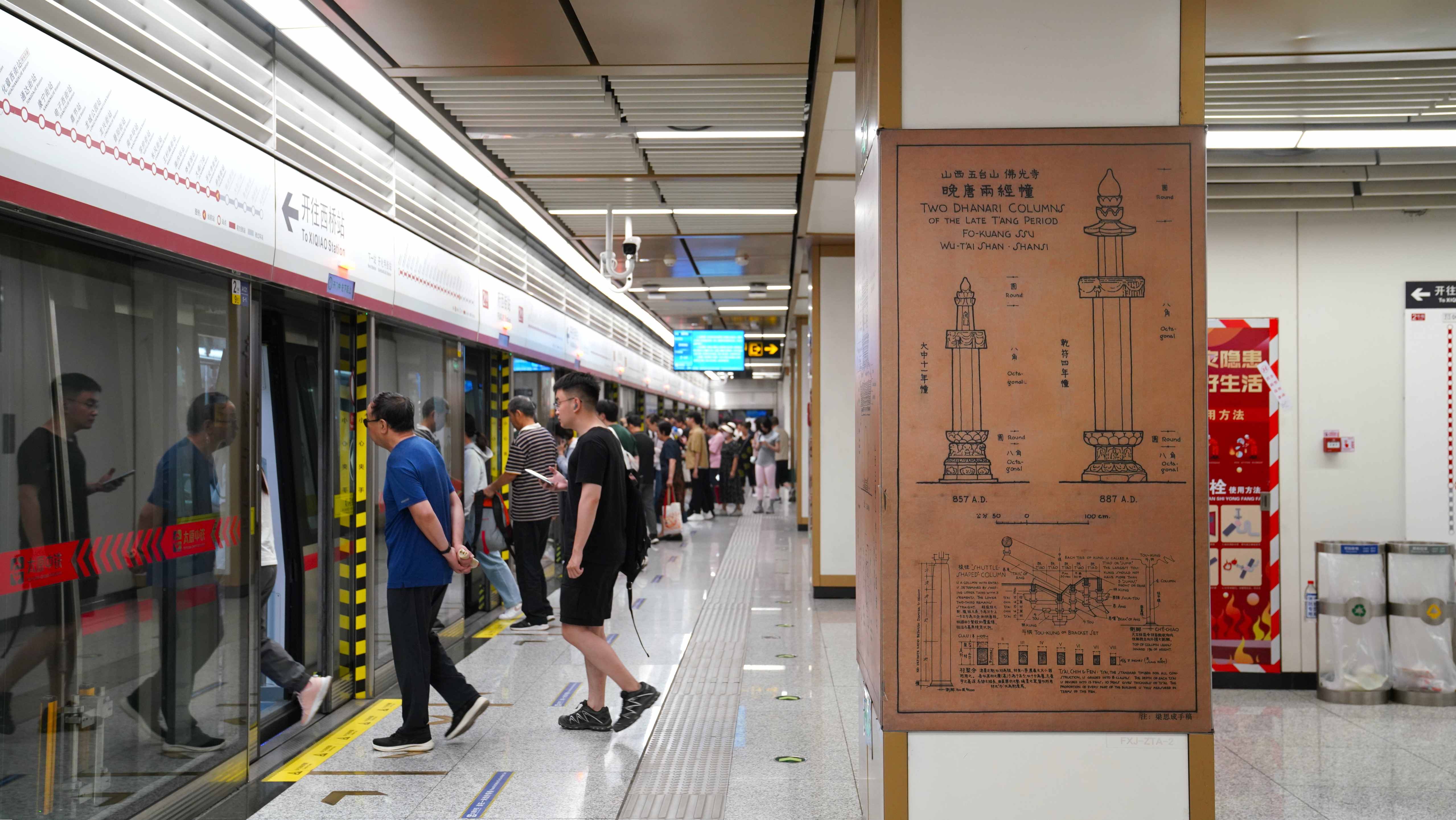 連永樂宮壁畫的絢麗、云岡石窟大佛的莊嚴(yán)、應(yīng)縣木塔的精巧,都被藝術(shù)復(fù)刻在站廳里——等車的間隙,有人會盯著壁畫上的飛天出神,有人會摸著梁思成筆下的古塔紋路發(fā)呆,匆忙的通勤路,忽然就多了份文化的滋養(yǎng)。