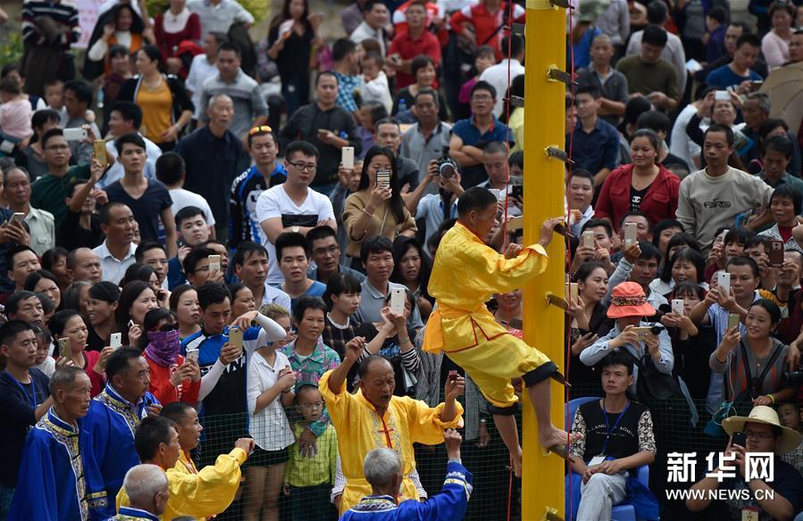 農(nóng)歷十月十五前后,福建西部武平縣各山村陸續(xù)進入農(nóng)閑時節(jié)。按照當?shù)仫L俗,不同村子各自擇日舉辦民間活動,其中較有代表性的就是“上刀山”絕技。“上刀山”絕技在閩西山村流傳已有數(shù)百年歷史,表演者需光腳順著磨得鋒利閃亮的36把鋼刀,攀登至8米高的杉木柱子頂部,接受長者祝福,祈求風調(diào)雨順、五谷豐登。新華社記者 宋為偉 攝