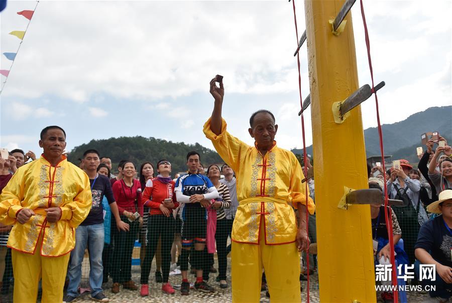 農(nóng)歷十月十五前后,福建西部武平縣各山村陸續(xù)進(jìn)入農(nóng)閑時(shí)節(jié)。按照當(dāng)?shù)仫L(fēng)俗,不同村子各自擇日舉辦民間活動(dòng),其中較有代表性的就是“上刀山”絕技?!吧系渡健苯^技在閩西山村流傳已有數(shù)百年歷史,表演者需光腳順著磨得鋒利閃亮的36把鋼刀,攀登至8米高的杉木柱子頂部,接受長者祝福,祈求風(fēng)調(diào)雨順、五谷豐登。新華社記者 宋為偉 攝