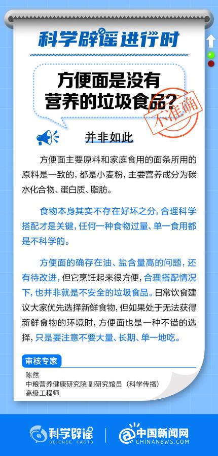 方便面的確存在油、鹽含量高的問(wèn)題,但它烹飪起來(lái)很方便,合理搭配情況下,也并非就是不安全的垃圾食品。日常飲食建議大家優(yōu)先選擇新鮮食物,但如果處于無(wú)法獲得新鮮食物的環(huán)境時(shí),方便面也是一種不錯(cuò)的選擇,只是要注意不要大量、長(zhǎng)期、單一地吃。(來(lái)源:@科學(xué)辟謠 @中國(guó)新聞網(wǎng) )