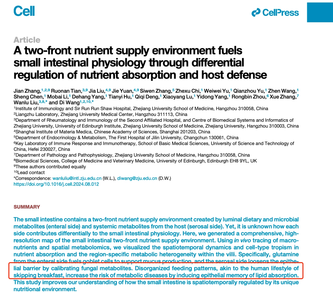 日前,浙江大學醫(yī)學院附屬邵逸夫醫(yī)院、浙江大學愛丁堡大學聯(lián)合學院、中國科學院上海藥物研究所的研究團隊,在頂尖學術期刊《細胞》(Cell)上合作發(fā)表一篇論文表明,不吃早餐的這種飲食習慣會改變小腸對營養(yǎng)物質(zhì)的吸收方式,從而會增加代謝性疾病的風險。