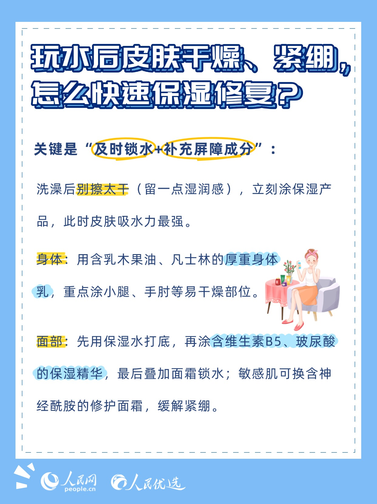 夏日炎炎,無(wú)論是泳池里的清涼暢游,還是海邊的逐浪嬉戲,都是驅(qū)散暑氣的不錯(cuò)選擇。但玩水的快樂(lè)背后,卻藏著不少傷害皮膚的“陷阱”——泳池的消毒劑、海邊的強(qiáng)紫外線、海水中的高鹽分,稍有不慎就可能引發(fā)皮膚干燥、泛紅、曬黑、長(zhǎng)斑甚至?xí)駛?。本期《人民?yōu)選來(lái)了》教你掌握科學(xué)的護(hù)膚方法,讓你在享受玩水樂(lè)趣的同時(shí),保持健康的肌膚狀態(tài)。