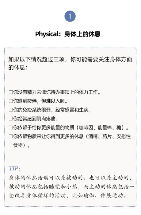 有內(nèi)科醫(yī)生根據(jù)研究和臨床經(jīng)驗(yàn),提出了7種類型的休息方式,幫助我們確定最需要哪一種。