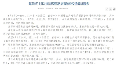 人民網(wǎng)北京8月6日電(董童)國家衛(wèi)生健康委于今日在官網(wǎng)發(fā)布的《截至8月5日24時新型冠狀病毒肺炎疫情最新情況》(以下簡稱“情況”)提出,8月5日0—24時,31個?。ㄗ灾螀^(qū)、直轄市)和新疆生產(chǎn)建設(shè)兵團(tuán)報告新增確診病例37例,其中境外輸入病例7例(上海5例,山東1例,陜西1例),本土病例30例(新疆27例,遼寧3例);無新增死亡病例;無新增疑似病例。當(dāng)日新增治愈出院病例10例,解除醫(yī)學(xué)觀察的密切接觸者474人,重癥病例較前一日減少2例。