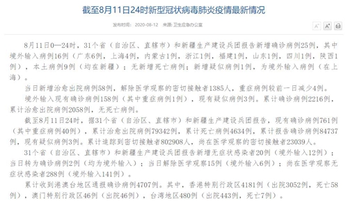 人民網(wǎng)北京8月12日電(董童)國(guó)家衛(wèi)生健康委于今日在官網(wǎng)發(fā)布的《截至8月11日24時(shí)新型冠狀病毒肺炎疫情最新情況》(以下簡(jiǎn)稱“情況”)提出,8月11日0—24時(shí),31個(gè)?。ㄗ灾螀^(qū)、直轄市)和新疆生產(chǎn)建設(shè)兵團(tuán)報(bào)告新增確診病例25例,其中境外輸入病例16例(廣東6例,上海4例,內(nèi)蒙古1例,浙江1例,福建1例,山東1例,四川1例,陜西1例),本土病例9例(均在新疆);無新增死亡病例;新增疑似病例1例,為境外輸入病例(在上海)。當(dāng)日新增治愈出院病例58例,解除醫(yī)學(xué)觀察的密切接觸者1385人,重癥病例較前一日減少4例。