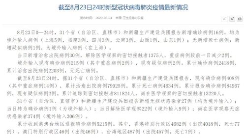 情況顯示,截至8月23日24時,據(jù)31個?。ㄗ灾螀^(qū)、直轄市)和新疆生產(chǎn)建設(shè)兵團(tuán)報告,現(xiàn)有確診病例408例(其中重癥病例14例),累計治愈出院病例79925例,累計死亡病例4634例,累計報告確診病例84967例,現(xiàn)有疑似病例2例。累計追蹤到密切接觸者811824人,尚在醫(yī)學(xué)觀察的密切接觸者13220人。