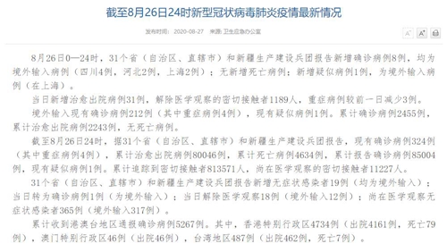 情況顯示,截至8月26日24時,據(jù)31個?。ㄗ灾螀^(qū)、直轄市)和新疆生產(chǎn)建設(shè)兵團報告,現(xiàn)有確診病例324例(其中重癥病例4例),累計治愈出院病例80046例,累計死亡病例4634例,累計報告確診病例85004例,現(xiàn)有疑似病例1例。累計追蹤到密切接觸者813571人,尚在醫(yī)學(xué)觀察的密切接觸者11227人。
