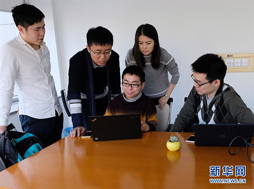 矣曉沅(左三)與同學們在實驗室討論會上(資料照片)。 新華社發(fā)