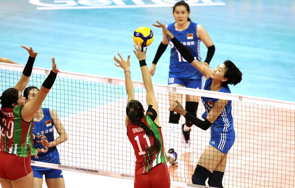 9月17日,中國隊球員袁心玥(右一)在比賽中扣球。當日,在浙江省寧波市舉行的巴黎奧運會女排資格賽A組比賽中,中國隊以3:0戰(zhàn)勝墨西哥隊。新華社記者 陳斌 攝